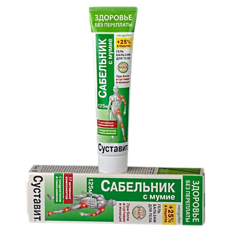 Гель - бальзам Суставит. Сабельник с мумиё -эффективное средство на основе природных компонентов для предупреждения суставных заболеваний. Способствует нормализации функционального состояния суставов, помогает предотвратить боли и воспаление в суставах, мышцах и позвоночнике. Поддерживает функциональное состояние опорно-двигательного аппарата, снижает риск развития остеоартрозов и остеохондроза.