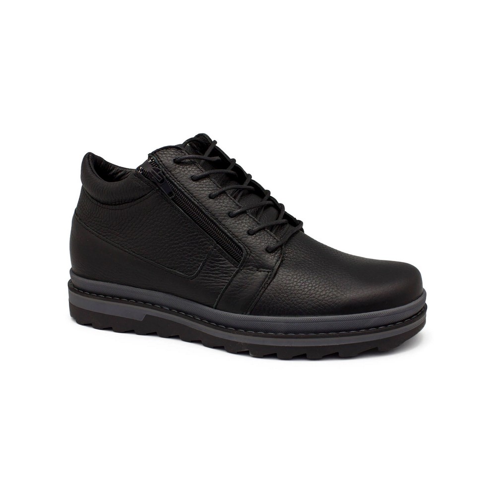 Верх обуви выполнен из натуральной кожи; подкладка из ворсина обеспечит утепление и уют ногам. Две боковые молнии и шнуровка помогут легко снять и надеть ботинок, а также идеально подогнать его по ноге, обеспечивая широкую раскрываемость. Модель также оснащена толстой нескользящей подошвой для безопасных прогулок в гололед.